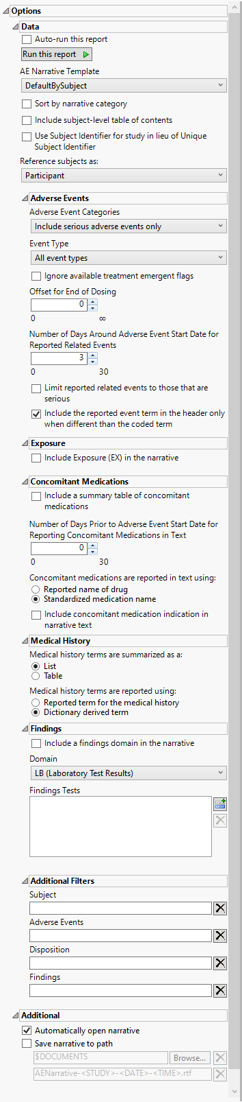 Check this box to automatically save the narrative output to the specified location. Your Documents folder is specified by default. The narrative rtf file is identified as AENarrative-<Study>-<Date>-<Time>, where <STUDY> is the name of the study and <Date>-<Time> is the date and time the narrative was run.