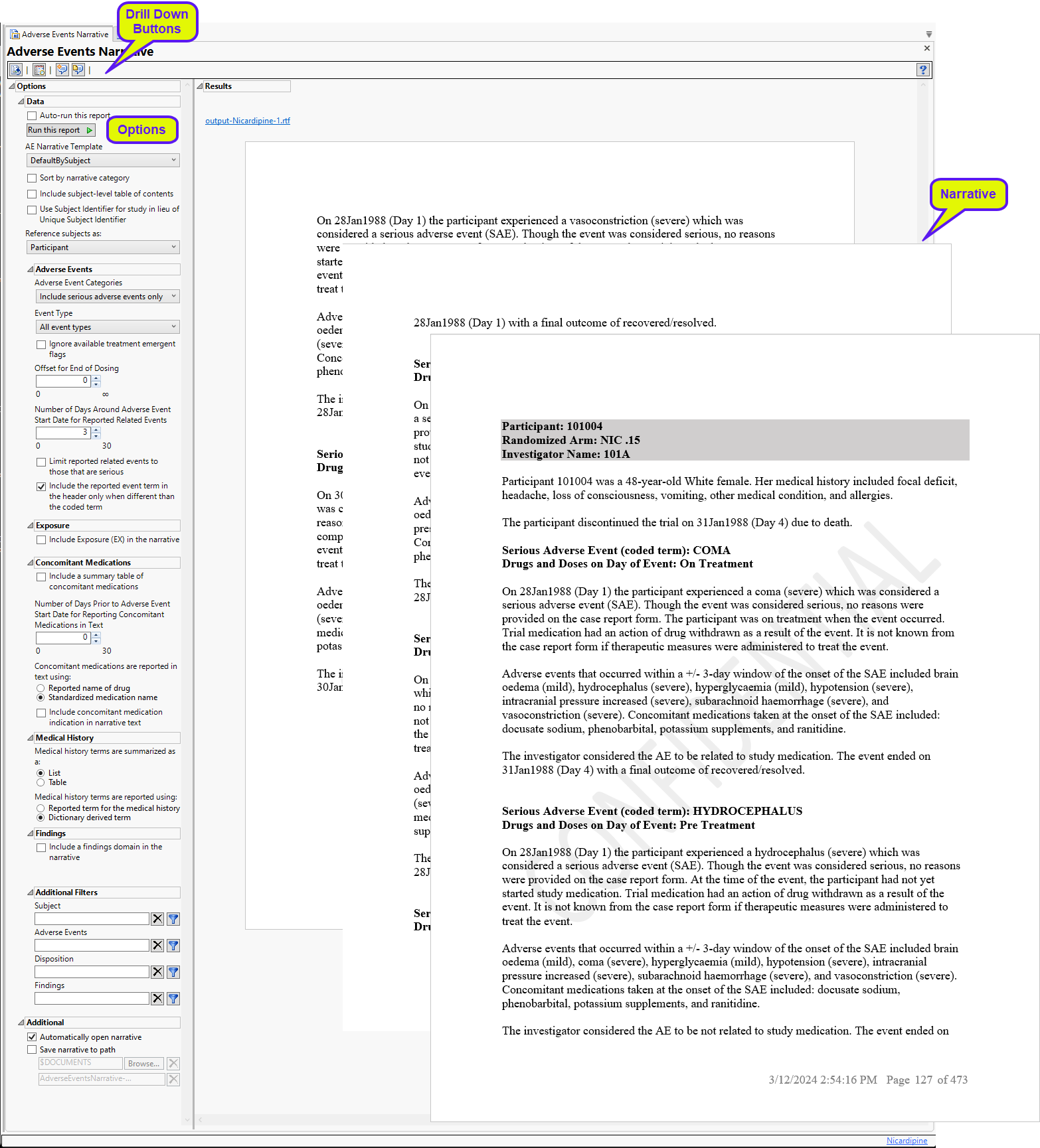 A narrative, containing descriptions of all of the observed adverse events, is generated for each patient. The narrative for the Nicardipine example is 473 pages long. In the example shown here, subject 101004 experienced 5 adverse events that are described over 3 pages.