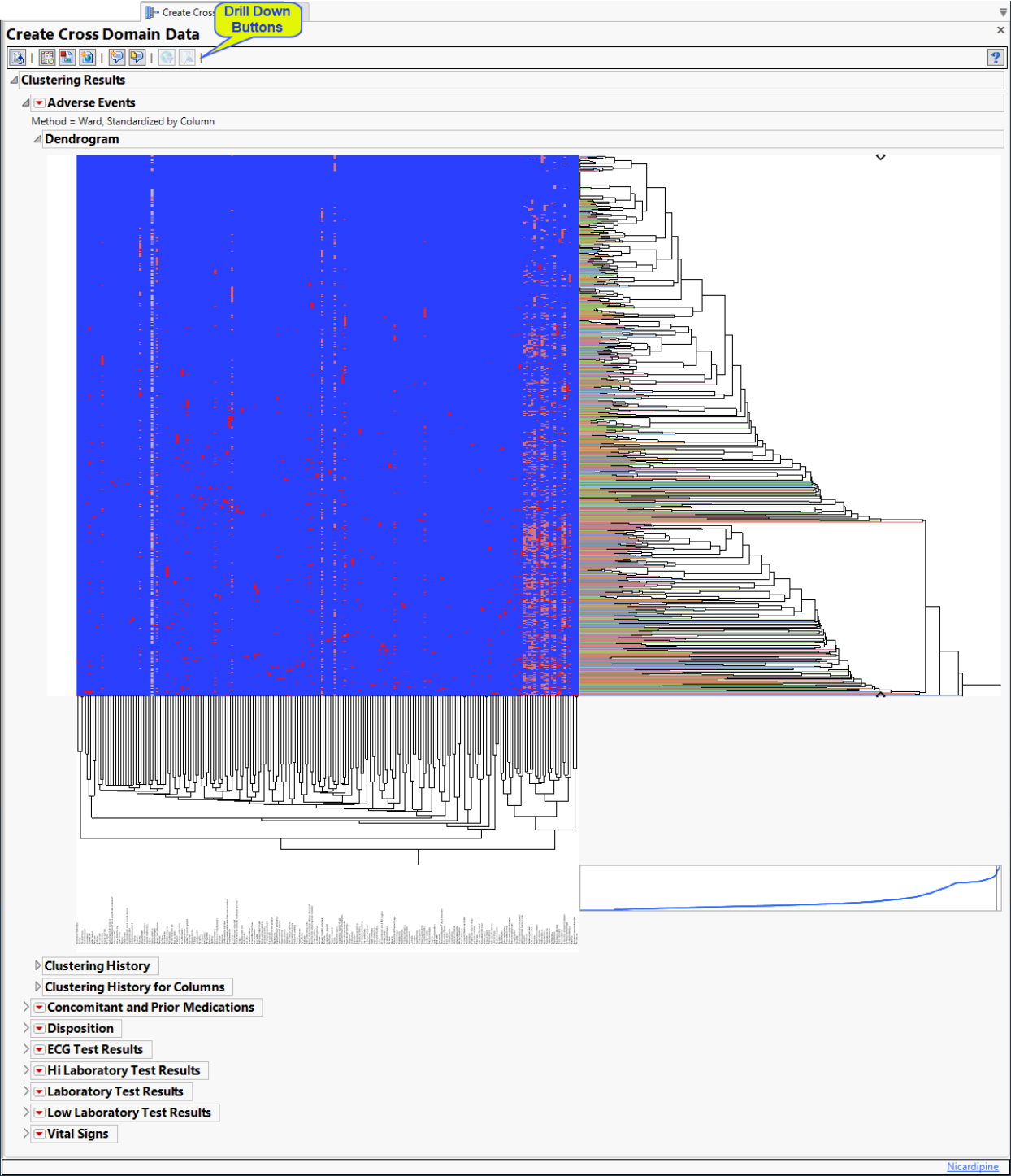 Hierarchically clusters all binary indicator variables. A separate section is created for each domain (Adverse Events (AE), Concomitant and Prior Medications (CM and MH), Disposition (DS), Electrocardiogram (ECG), Hi and Low Laboratory Results (LB), and selected Vital Signs (VS)) that has binary variables, depending on the options selected. The binary variables are converted to 0s and 1s and clustered.