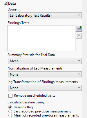 Use this widget to specify whether to plot the distribution of measurements from either the Electrocardiogram (EG), Laboratory (LB), or Vital Signs (VS) findings domains.