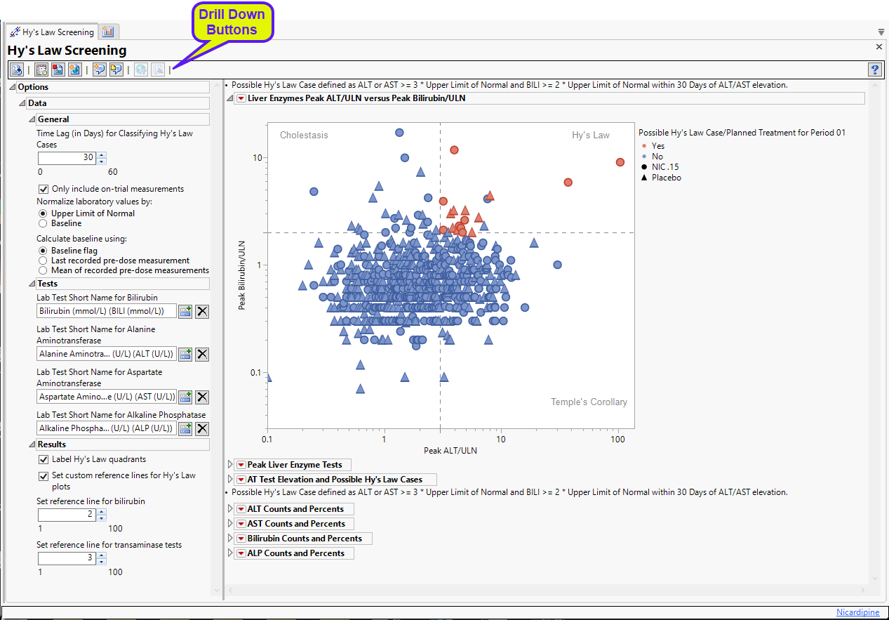 Selecting Label Hy’s Law quadrants places identifying labels, relating to Hy’s law, in each quadrant of all of the plots of bilirubin versus alanine aminotransferase.