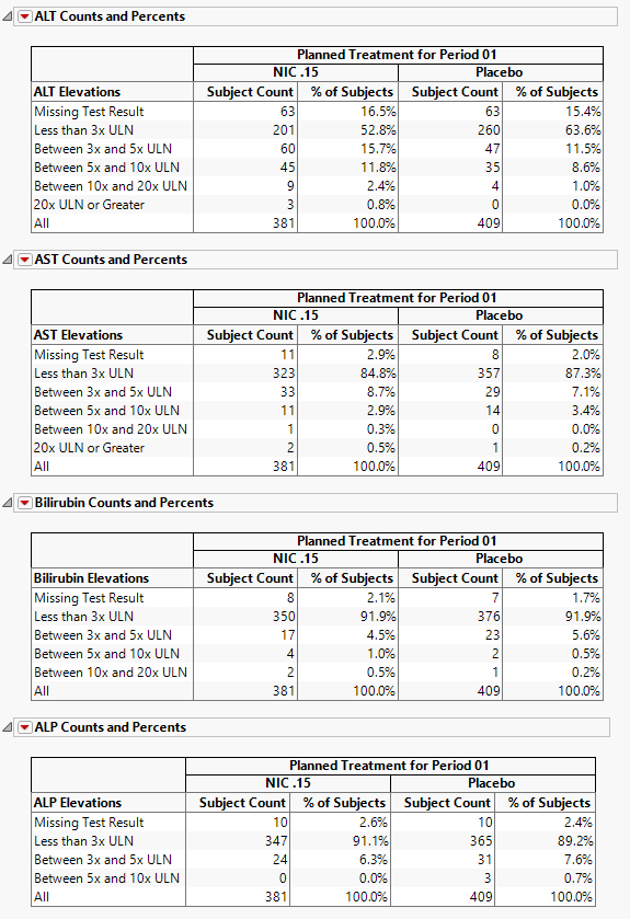 Important: The counts and percentages for Missing Test Result on this section are calculated out of all subjects that have at least one nonmissing result for at least one of the liver lab tests. The counts shown on the Hy’s Law Screening section include subjects that had no record or were missing all values for all four liver lab tests.