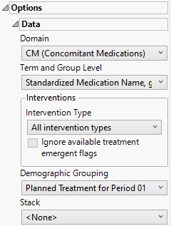 Use this widget to select the intervention domain (either Concomitant Medications or Exposure , for example)to analyze.