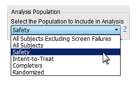 This list is populated with available population that can be defined for the current Study based on flags found in the ADSL, ADDM, or DM (and optionally SUPPDM) data sets. Possible populations are listed in the following table:
