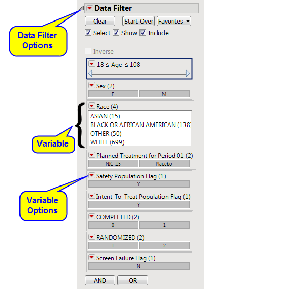 The Data Filter command is a JMP report that gives you a variety of ways to select, hide, or exclude subsets of data from plots and analyses. It is surfaced in many JMP Clinical reports.