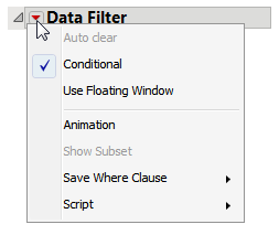 Note: There are two additional options when filtering: Auto clear and Conditional. These options are available from the red triangle menu for the Data Filter.