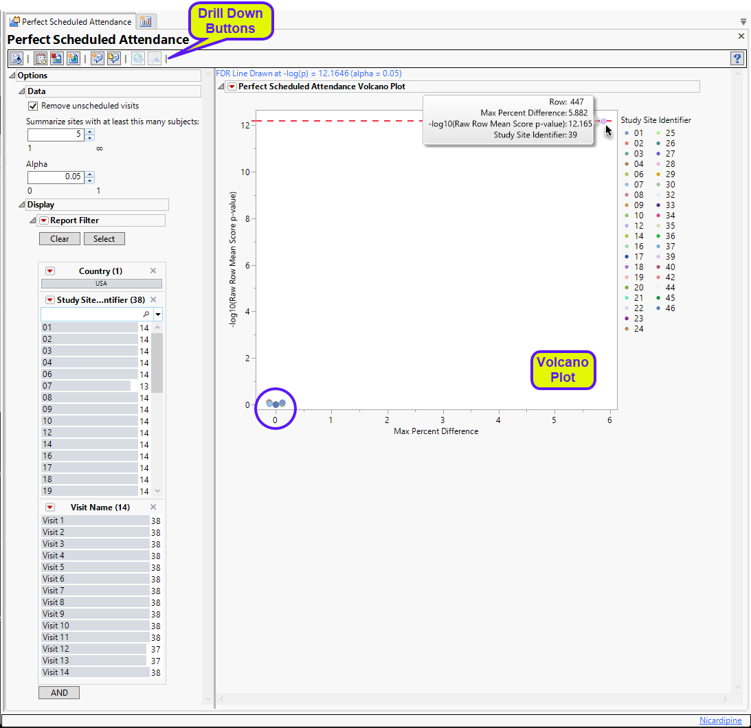 The Perfect Scheduled Attendance report initially shows one Volcano Plot