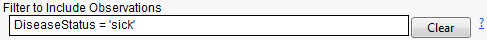 | 8 | To use the previous example, type DiseaseStatus = ‘sick’, as shown below, to retain only the diseased individuals from the input data set. |