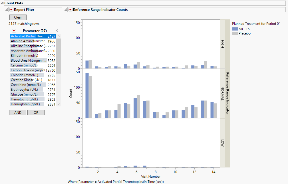 These plots show the distribution of measurements across categories of the Reference Range Indicator variable (xxNRIND). For example, you can see how many laboratory measurements for a given test were categorized as HIGH, NORMAL, or LOW based on values of the Reference Range Upper Limit and Reference Range Lower Limit (LBSTNRLO and LBSTNRHI, respectively). The graph contains bars representing the counts within each category for each treatment across Study Visits (VISIT or VISITNUM).