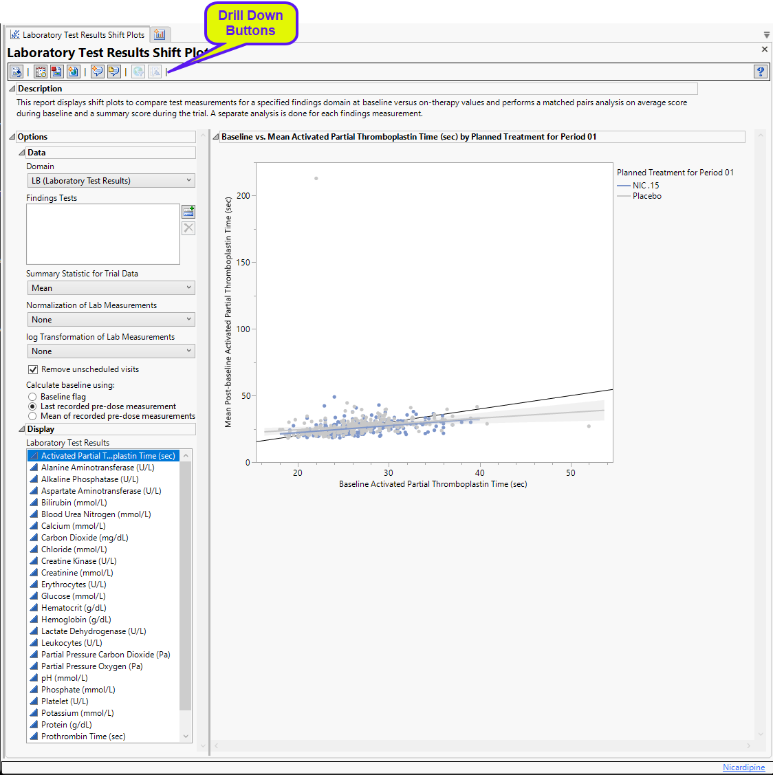 Running Findings Shift Plots for Nicardipine using default settings generates the report shown below.