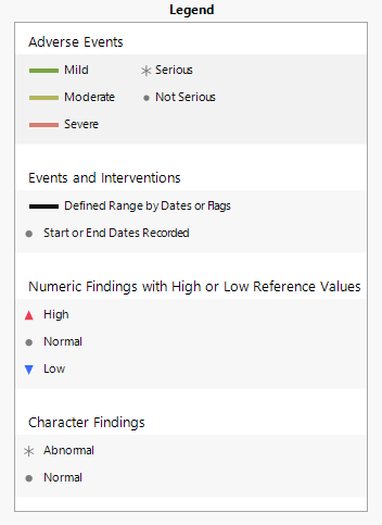 The top panel (shown below) denotes symbols and colors used for adverse events. Blue, green, or red bars indicate that the events are mild, moderate, or severe, respectively, as specified by the values in the SDTM variable aesev