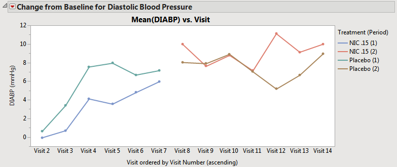 | • | When the Pool subjects in average time trend plots when treatment crossover is detected box is checked, but the Overlay visits when treatment crossover is detected box is not checked, the subjects that have the same value for treatment across different periods are pooled to calculate the average trend across the visit(s). For example, subjects assigned to Placebo on period 1 are pooled with subjects assigned to Placebo on period 2, and only one line is displayed for Placebo, as shown below. |