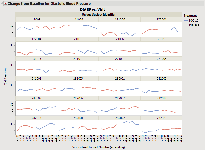 Caution: You should check this box only if you want to overlay findings trends across the same time points (if detected) for treatments from different visits. Treatment crossover periods must coincide with Visits or unexpected results might occur. When this option is checked, any information about which treatment a subject was given at a visit is no longer discernible.