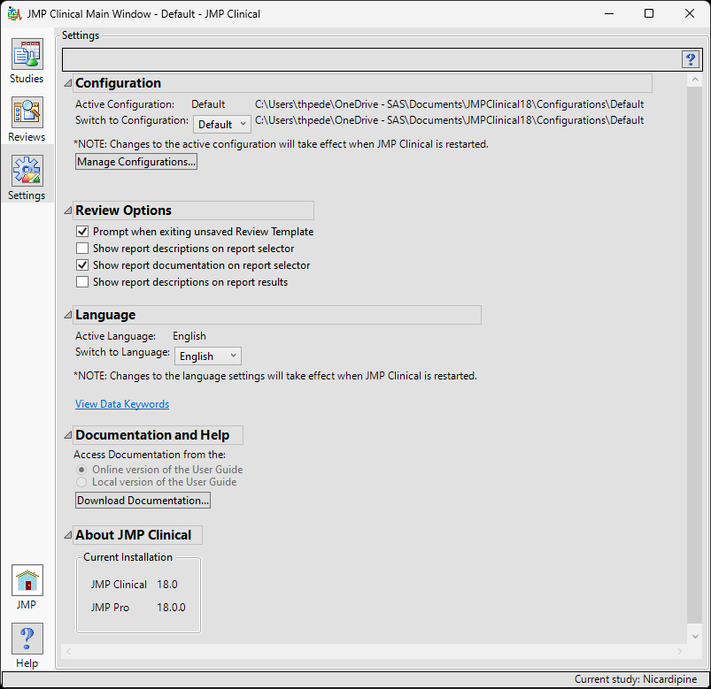 This section displays the current configuration, the paths to the user root directory, system preferences, and user documentation and other files used and created by JMP Clinical. An option for viewing the paths to all relevant directories can be selected.