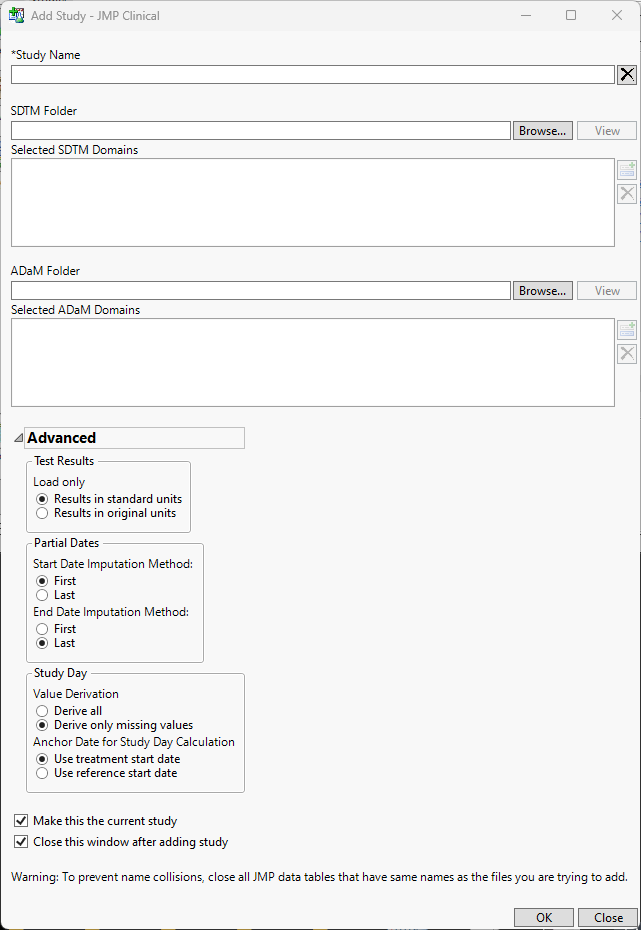 Note: When adding a clinical study and assigning both ADAM and SDTM domains, the ADAM equivalent of each domain is added and the corresponding SDTM data set excluded. For example, if both ADAE and AE are present, then ADAE takes precedence and is included, whereas AE is not included.