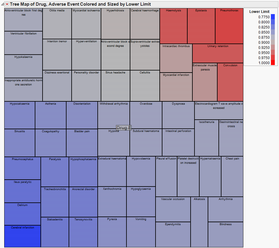 A tree map is a graphic of hierarchical data represented by nested, tiled, colored rectangles. Every branch of the hierarchical tree is assigned a rectangle, which in turn is tiled with successively smaller rectangles corresponding to sub-branches. Rectangle area is proportional to a specified data attribute (for example, count). Rectangle color denotes either the same or some other attribute (for example, lower limit). Shown below is an example.