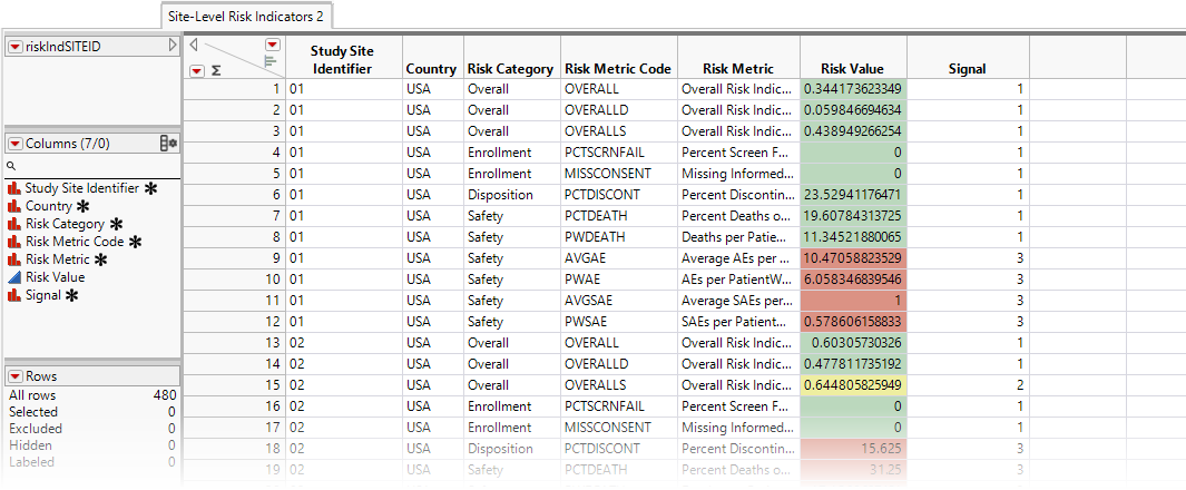 | • | Site-Level Risk Indicators: This data table displays risk indicators summarized at the site level. Risk indicators with defined thresholds are colored in green, yellow, or red. Each site-level risk indicator is in a separate column. This is a "short" and "wide" data table. |