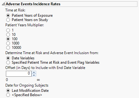 Use the Determine Time at Risk and Adverse Event inclusion from: widget to specify whether JMP Clinical should calculate patient years and event inclusion based on study date variables or from derived patient years/time at risk and event inclusion flags.