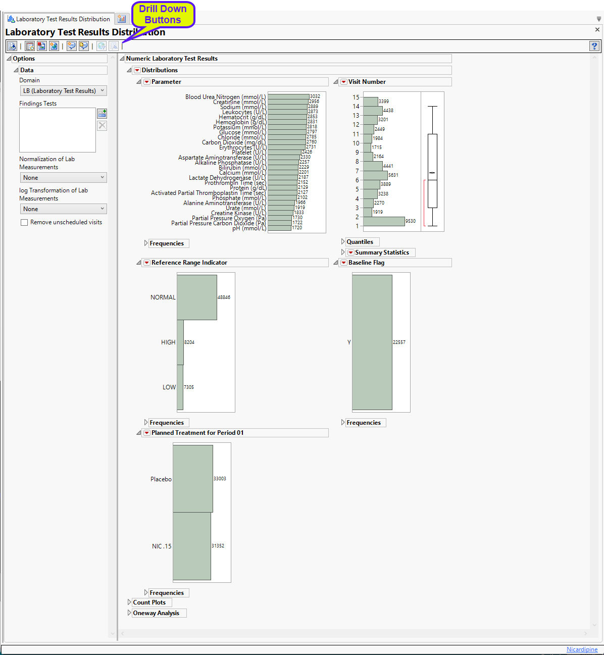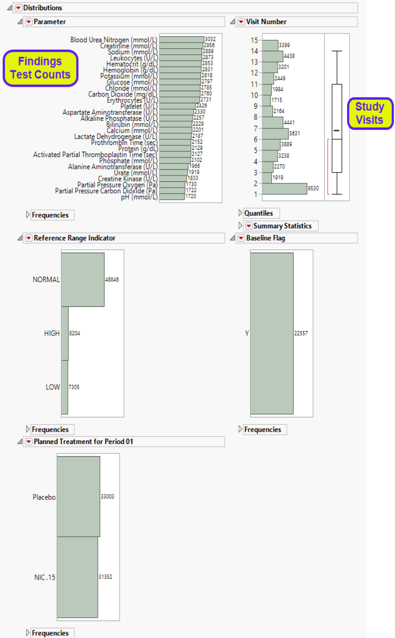 These display counts and histograms of relevant variables in the Findings data set. A distribution of subjects on the Actual, Planned, or Specified Treatment is shown as well as other findings variables (if present). Findings variables displayed can include the Reference Range Indicator1 (xxNRIND), the Visit and Time Points at which findings were taken (VISIT and xxTPT), and Baseline Flag (xxBLFL.