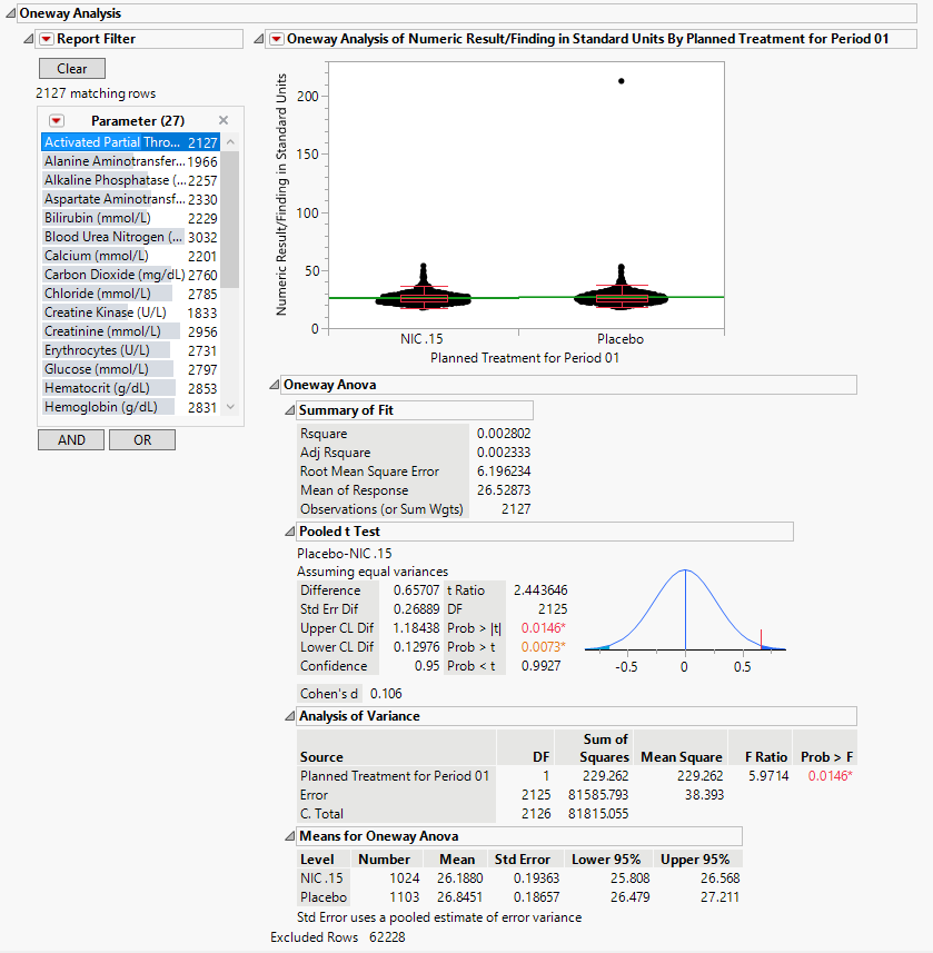 Note that, initially, this analysis is across all measurements taken during the study and should be used to get an idea of possibly significant differences in measurements across treatment arms. You can select individual tests to be displayed using the data filter at left.