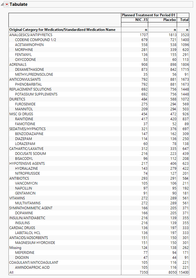 The Tabulate section contains one Table detailing the counts for each treatment group, for each intervention within each specified term and group level. The counts, represented by n, are the number of subjects who experienced the given intervention. The All row at the bottom of the table is the total number of interventions in the given treatment arm.