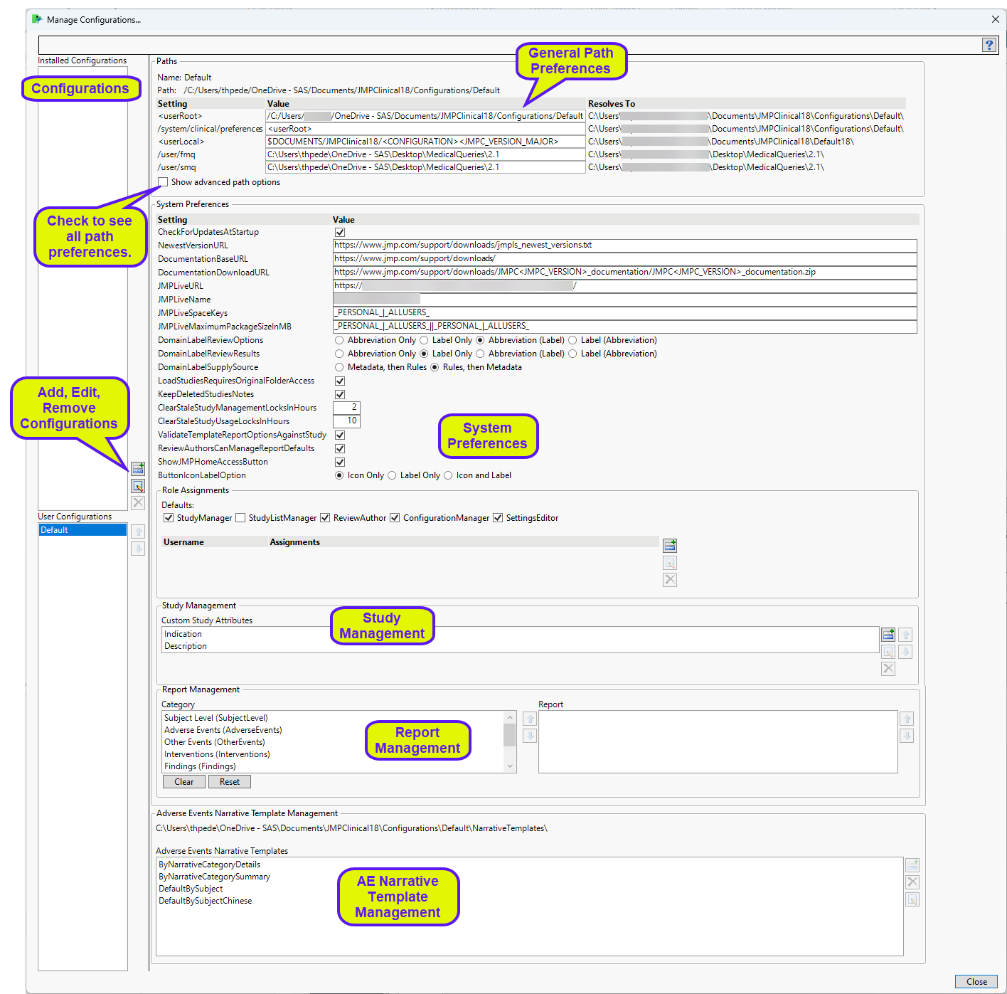 Files are shipped with JMP Clinical and whose purpose is to control configurations, path preferences, and system preferences. On Windows machines, they are found in the C:\Users\<user>\Documents\JMPClinical18\Configurations\Default directory. On Macs, they are found in the /Library/Application Support/JMP/18/Clinical folder.