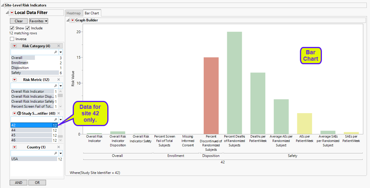 | • | A bar chart showing the risk value for each indicator across the sites. The data in the following bar chart were filtered to site 42 only. |