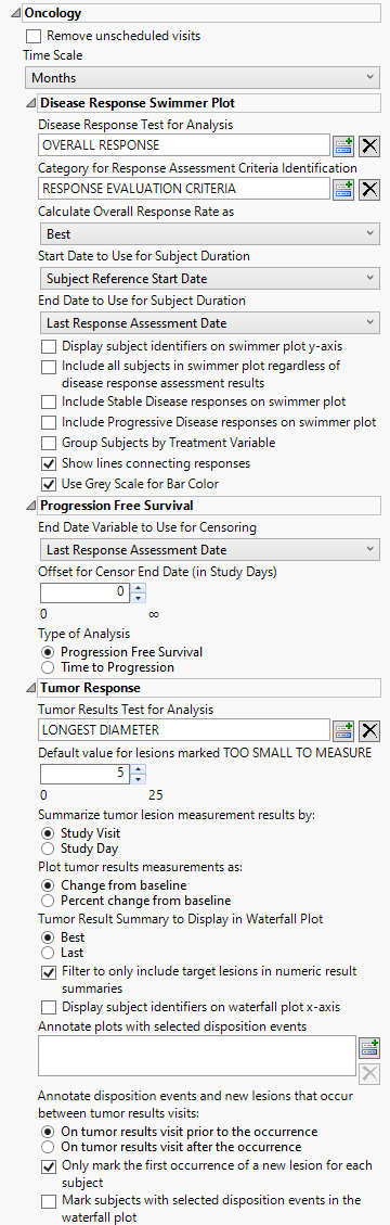 For patients who survive progression-free beyond the end of the study, the ultimate progression-free survival values for these individuals are unknown. All that can be said is that progression-free survival exceeds the period of the study; these data are considered censored. For these cases, you must specify the end date for collecting data to assess progression. The End Date Variable to Use for Censoring widget is used to select which variable date reference from the demography domain to use for calculating the censored disease progression values. Patients who progress after this date are not considered as progressing. The Last Response Assessment Date is chosen by default.