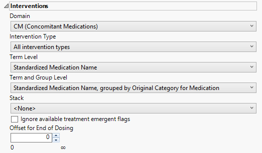 Use this widget to specify the term used in the Treatment variable to specify the study's control. The Treatment Control Level is specified as either “Placebo” or “Pbo”, depending on the value found in your data, by default.