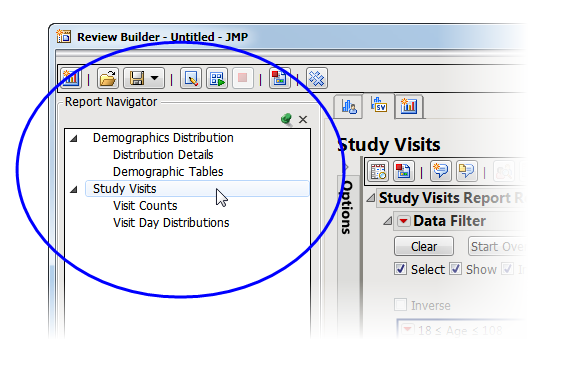 The Report Navigator opens on the left side of the Review Builder .