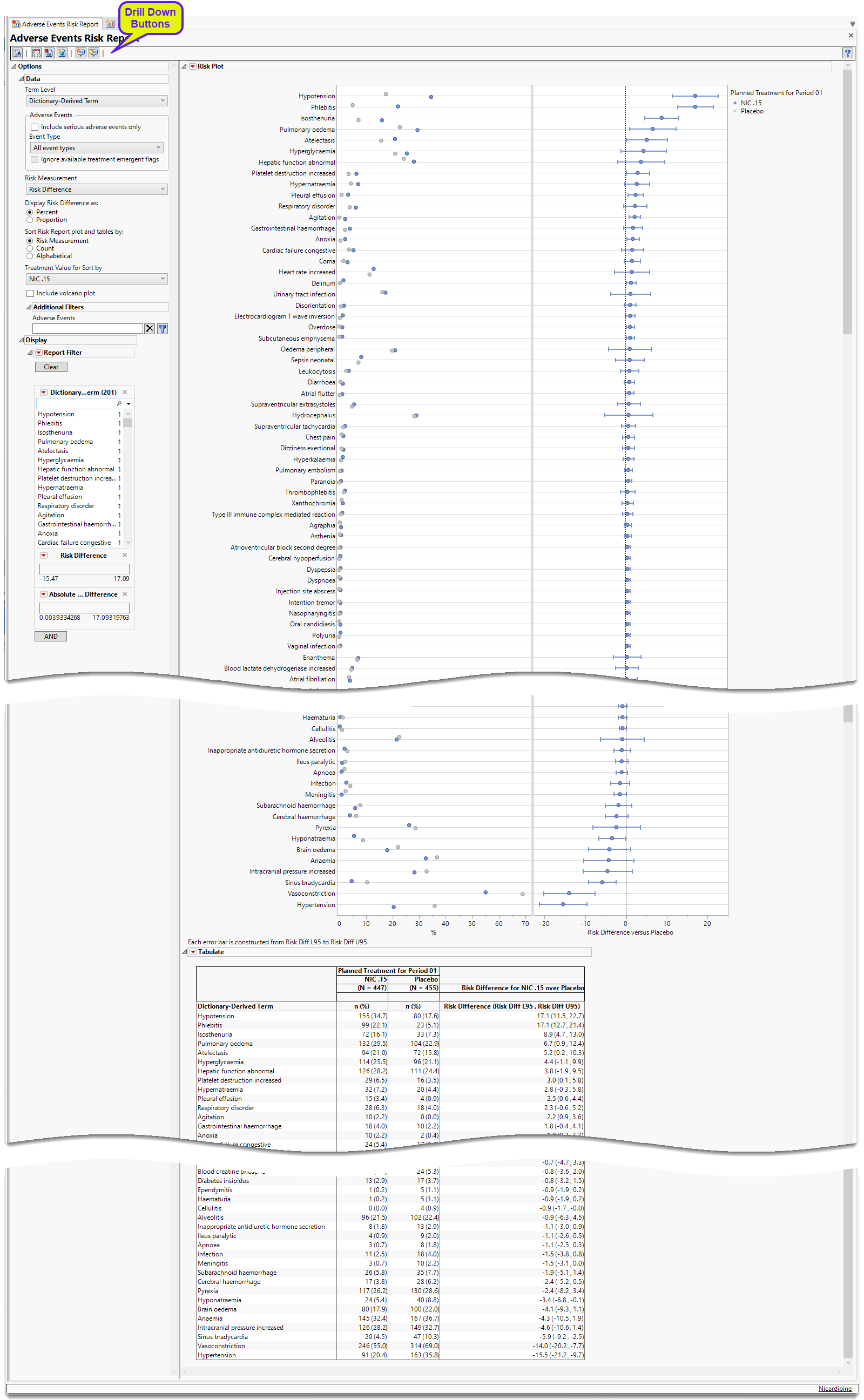 Running Adverse Events Risk Report using the Nicardipine sample data for risk differences generates the report shown below.