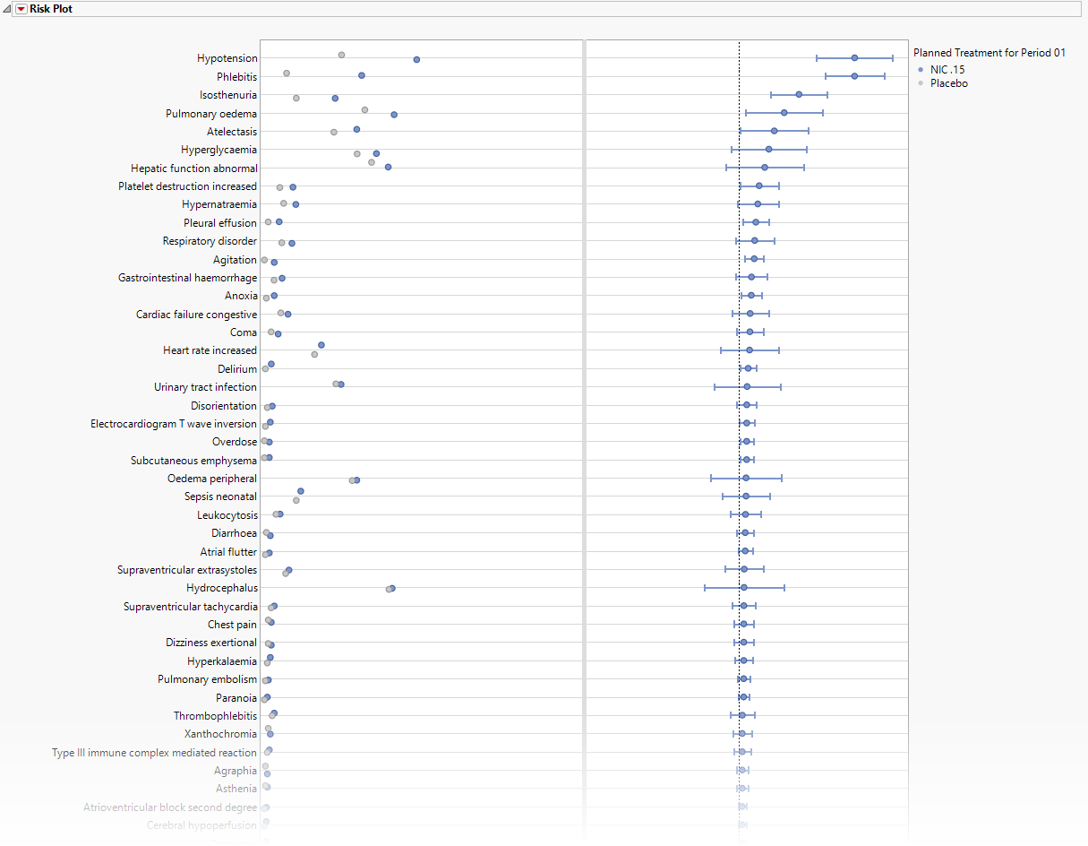 | • | One Forest Plot showing the risk difference measurements with 95% confidence intervals for all of the adverse events exhibited by the subjects. In the plot shown below, the risk difference with unadjusted 95% confidence intervals1 for each event are presented. Events shown are restricted to the specified group or term level, when specified. |