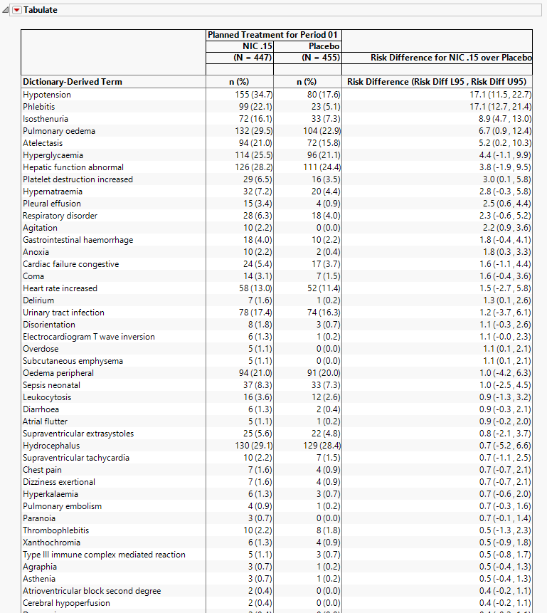 | • | The table presents an alternate view, listing the subject counts experiencing an event and the respective percent of subjects (in parentheses) on each treatment arm, as well as the risk difference and 95% confidence interval (in parentheses) for the terms (or those terms falling under selected groups, when specified). |