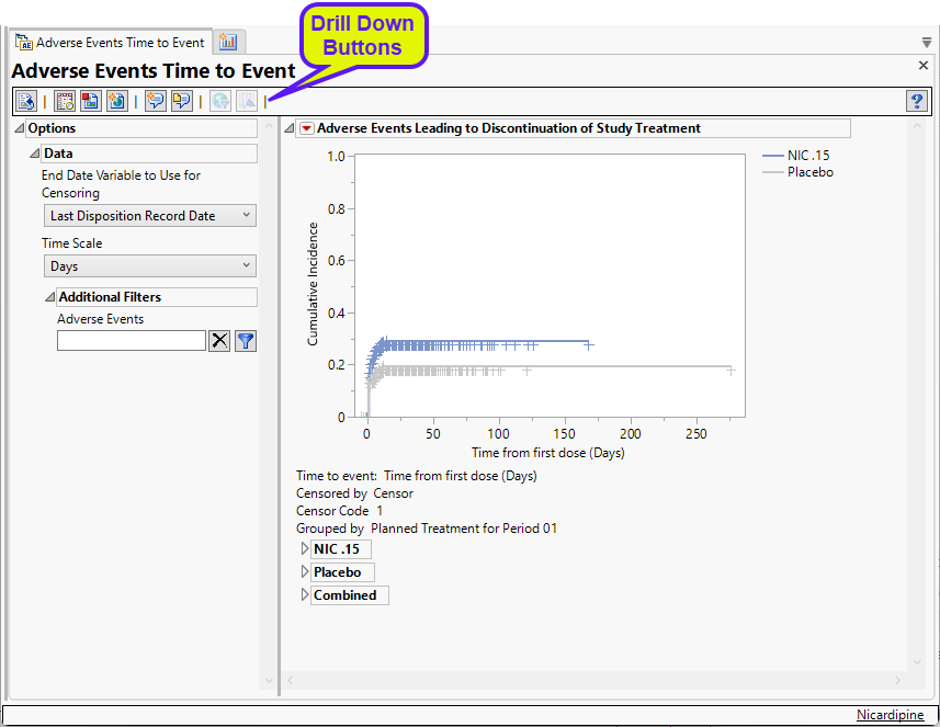 This plot shows the cumulative incidence of adverse events over the time elapsed from the first treatment dose. Examination of this plot enables one to see when the events occurred and gives an accurate estimate of the incidence by treatment group. Subjects are censored at the date of the last disposition record unless another date is chosen.