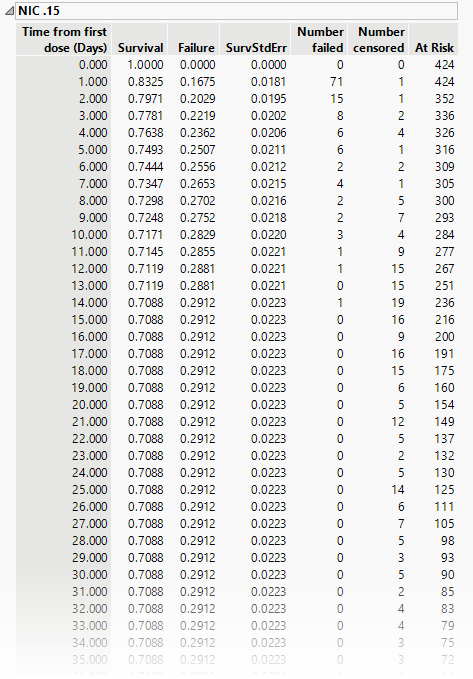 The tables list time from the first dose and, at each time point, both survival in the trial and failure to continue, absolute number failed or censored and the number remaining at risk.