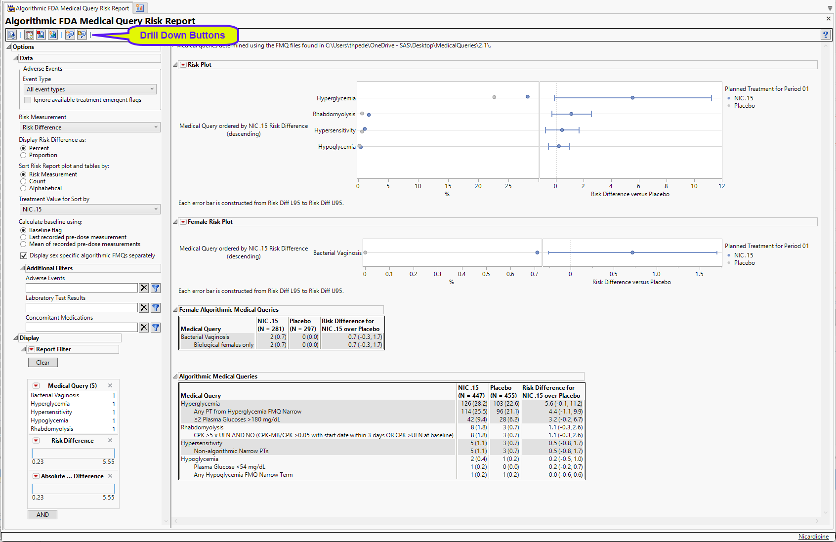 Running Algorithmic FMQ Medical Query Risk Report for a modified Nicardipine study using FMQ v2.1 files generates the Report shown below.