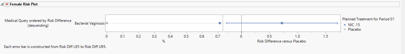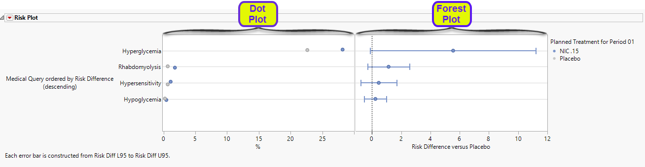 There are two plots shown here. Medical queries are shown on the y axis. The dot plot on the left of each group shows the percentile occurrence of subjects in each arm exhibiting the queries. The Forest plot on the right of each group shows the risk difference for subjects to exhibit events covered by each query.