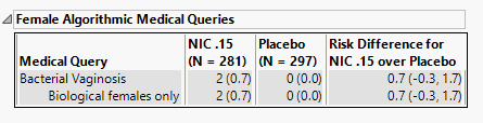 Patients are assessed for each medical query they experience and Percent Occurrence and Risk Difference are calculated for each query by treatment group. Percent Occurrence is simply the percentage of patients in a treatment group who experience the query at least once during the trial period. Risk difference is calculated by subtracting the number of patients exhibiting the query in the control group from the number of patients exhibiting the query in the treatment arm. Relative Risk or Odds Ratios may also be calculated.
