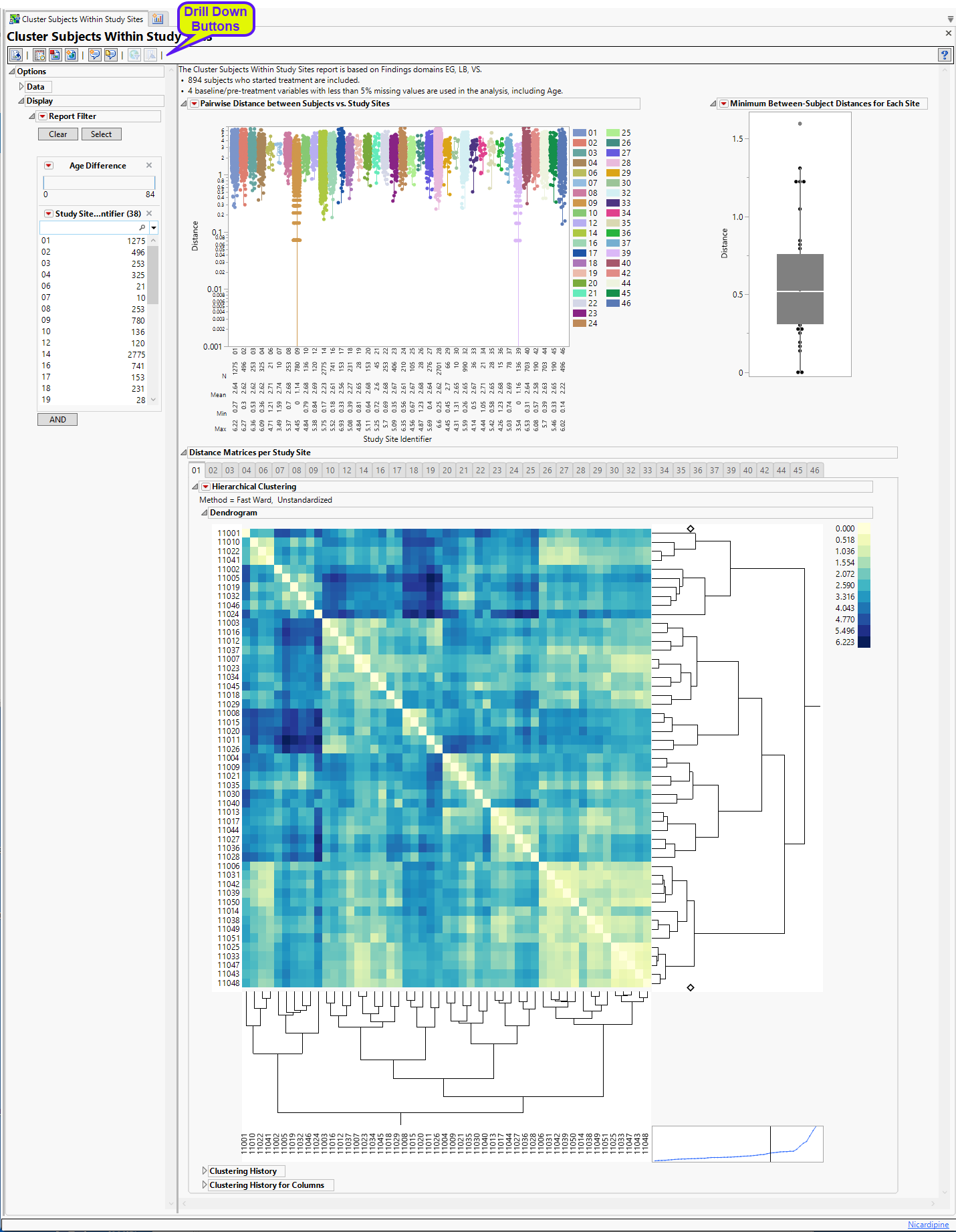 Bluer color indicates subjects that are more similar, whereas yellow shows subjects less similar. The clustering dendrogram is presented to the right of the heat map and can show sets of more than two subjects that are similar to one another. All the pairwise distance matrices, along with the subjects' ID , study sites and treatment arms, are stored in separate jmp tables, and can be accessed by clicking the 'Show Tables' button.