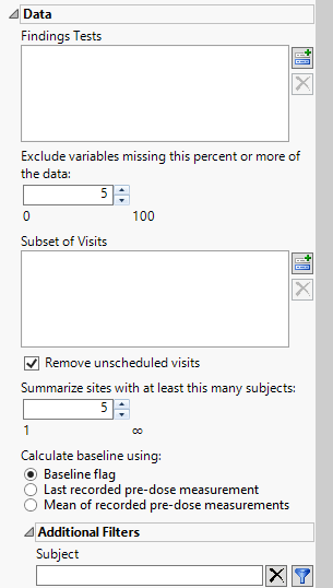 By default, findings analyses are conducted assuming that sufficient numbers of subjects have participated to make the results statistically significant. Use this option to specify a threshold at which the level of missing data becomes unacceptable. Tests with levels of missing data exceeding this threshold are removed from the analysis for that visit and time point. The default value for this threshold is 30%, so any tests missing data from more than 30% of the subjects at Visit x are removed from the analysis of that visit.