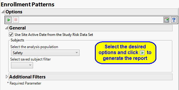 Filters enable you to restrict the analysis to a specific subset of subjects based on values within variables. You can also filter based on population flags (Safety is selected by default) within the study data.