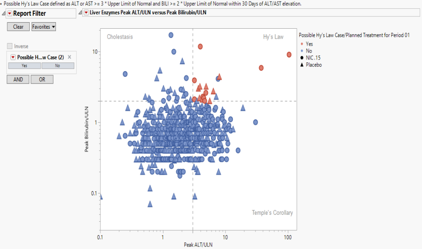 These limits are also used to create the Hy's Law indicator flag. Subjects with a test value exceeding 3*ULN for ALT or AST (signs of hepatocellular injury) accompanied or followed by elevation of 2*ULN or greater for the BILI test will have a "Yes" value for the Hy's Law Case variable created. A note defining the Hy's Law flag is located above the scatterplot matrix. For example, with the default settings the note is as follows: "Hys Law Cases are flagged if ALT or AST >= 3*ULN and BILI >= 2*ULN within 0 Days of ALT/AST peak." You can change the number of days following ALT/AST elevation for which to look for BILI elevation to flag possible Hy's Law cases on the report dialog. Subjects in the plot are colored by the Hy's Law criteria (red for "Yes", blue for "No") and marked by their treatment arm. You can choose to label the quadrants of Hy's Law (Cholestasis, Hy's Law, and Temple's Corollary) in the bottom left scatterplot through a check box option on the dialog.