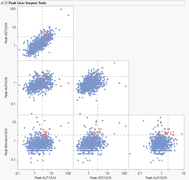 This report visualizes peak values for lab measurements pertaining to Hy's Law for detecting potential liver toxicity for all subjects across treatment arms. Lab measurements for Bilirubin (BILI), Alanine Aminotransferase (ALT), Aspartate Aminotransferase (AST), and Alkaline Phosphatase (ALP) are divided by the upper limit of normal (ULN) and displayed in a scatterplot matrix annotated with Hy's Law reference lines (2*ULN of BILI, 3*ULN of ALT).