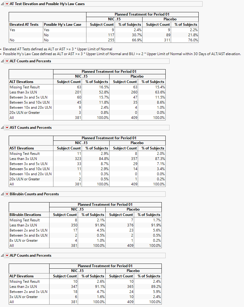 Important: The counts and percentages for Missing Test Result on this section are calculated out of all subjects that have at least one nonmissing result for at least one of the liver lab tests. The counts shown on the Hy’s Law Screening section include subjects that had no record or were missing all values for all four liver lab tests.