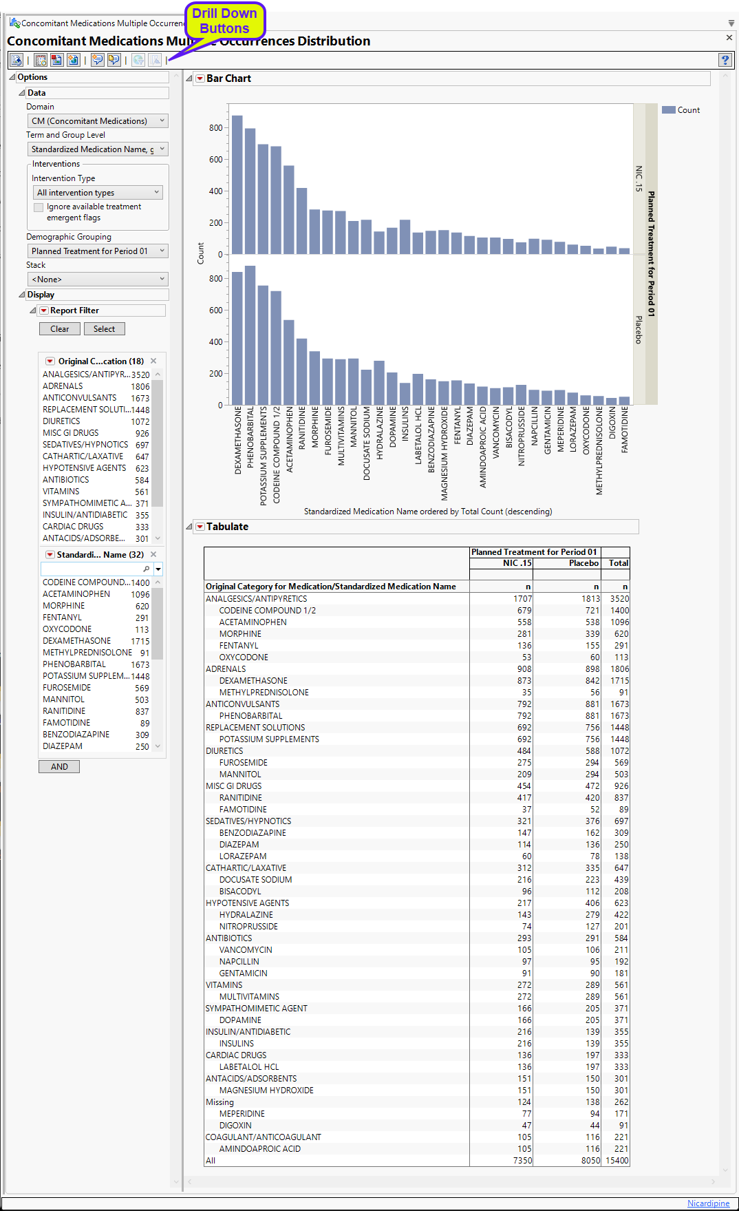 In the example shown here, counts of concomitant medications administered by treatment are displayed.