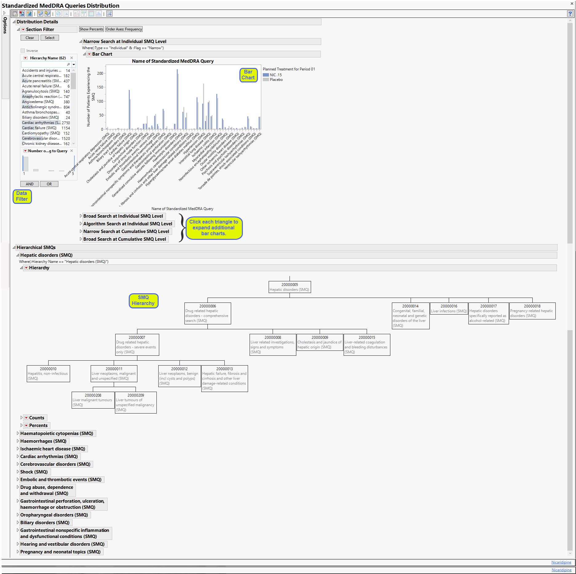 The hierarchy plots illustrate the grouping relationship of several related SMQs. Tables below each hierarchy provide the counts and percents of subjects that experience the SMQs both individually and cumulatively.