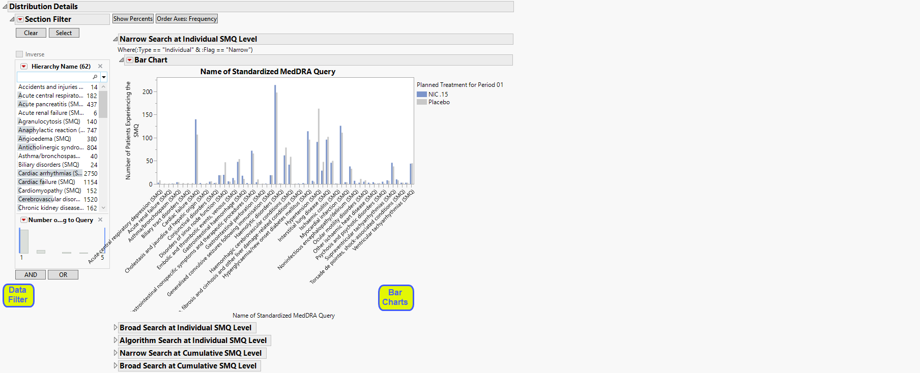 Bar charts are provided to summarize the major classes of SMQ: a) Narrow Search at the Individual Term Level (open by default), b) Broad Search at the Individual Term Level, c) Algorithm Search at the Individual Term Level, d) Narrow Search at the Cumulative Term Level, or e) Broad Search at the Cumulative Term Level. The bars display the frequency or percentage by treatment of subjects that meet the criteria for each SMQ.
