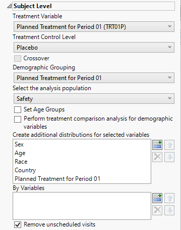Use the Treatment Variable widget to specify the variable defining the actual or planned treatment used in the study. Available variables might include either a planned treatment , which is selected when the treatments patients received exactly match what was planned the variable specifying the actual treatmentActual, which is selected when treatment deviates from what was planned. You can also specify any demographic variable from DM and/or ADSL as a surrogate for the treatment variables.