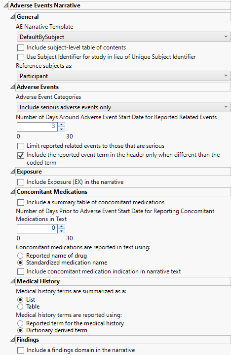 You might want to include in the narrative additional events that occur at or about the same time as the reported adverse events. Use the Number of days around Adverse Event start date for reported related events option to specify the number of days before and after the onset of the adverse event, within which the additional events are considered. only those events falling within the specified time are included in the narrative.