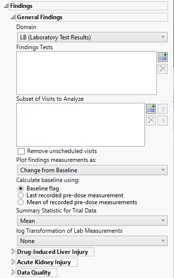 Use the Plot tumor results measurements as: widget to select the type of findings measurement values to plot. Selecting Change from baseline plots the change from the findings baseline measurements (determined by the xxBLFL variable or by Study Day less than 1). Selecting Percent Change from Baseline plots the percent change from the findings baseline measurements. Percent Change from Baseline is specified by default.